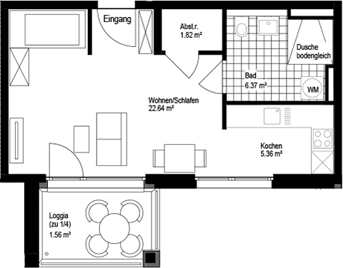 Der helle Wohn- und Schlafbereich mit integrierter Küchennische schafft ein offenes Raumgefühl, während das Bad mit bodengleicher Walk-In-Dusche modernen Komfort bietet.